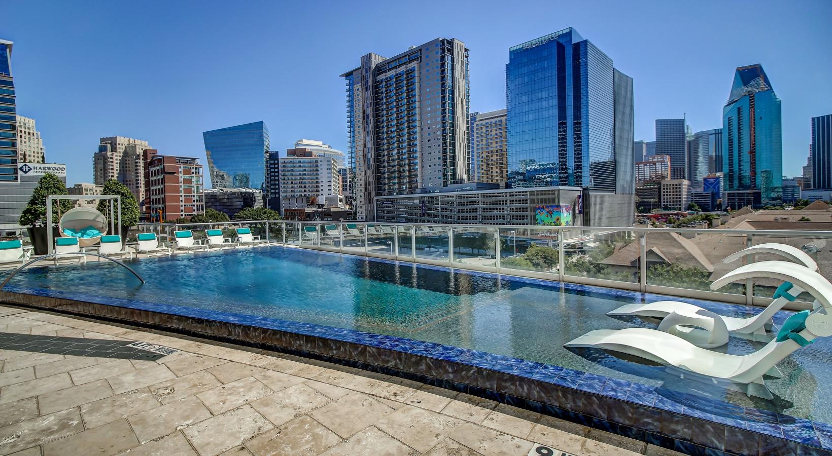 • a pool with lounge chairs and a city skyline in the background