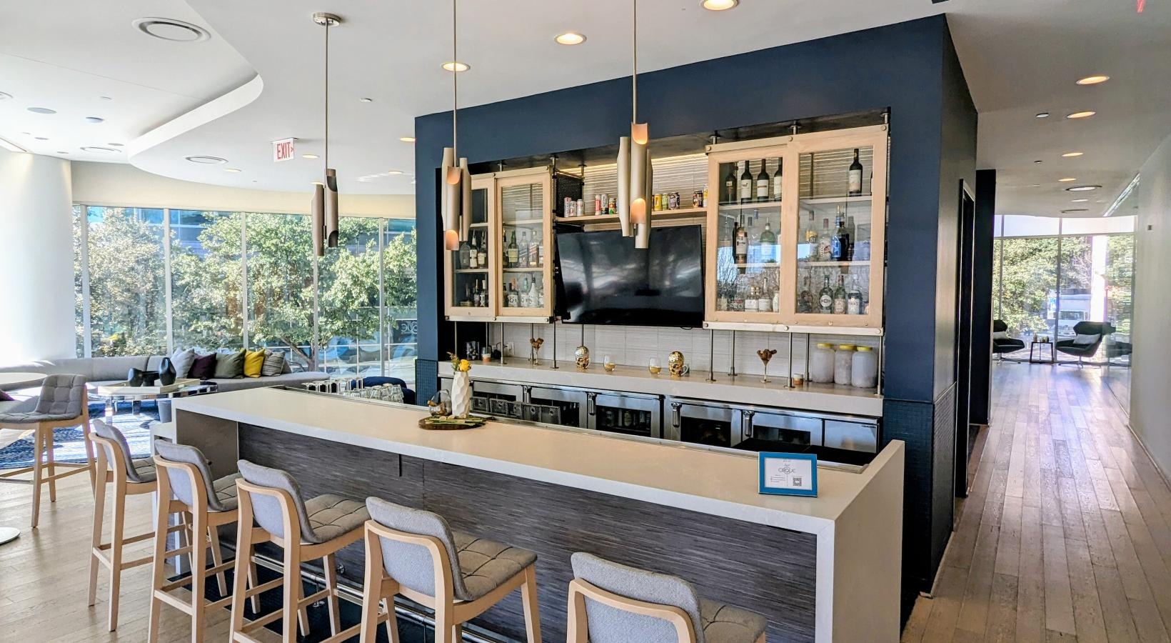 • a community kitchen with a bar and chairs